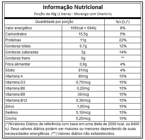 polirricinoleato de poliglicerol (emulsificantes), morango desidratado], peptídeos de colágeno, xarope de polidextrose, proteína concentrada do soro de leite, proteína isolada de soro de leite, óleo de palma, preparado de iogurte grego natural pó [soro de leite, maltodextrina, açúcar, cloreto de sódio, aroma