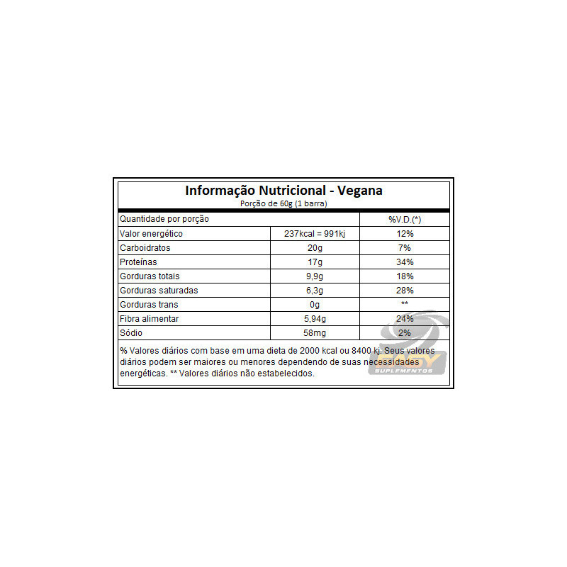 Brownie Vegano: Blend proteico (proteína isolada do arroz, proteína isolada de soja, proteína isolada de ervilha), xarope de sorbitol, goma acácia, cobertura de alfarroba, crispes de soja, gordura de palma, óleo de coco, polidextrose, glicerina bi destilada, cacau em pó, cloreto de sódio, emulsificante: lecitina de soja (INS 322), antioxidante natural: tocoferol, conservante: sorbato de potássio (INS 203).