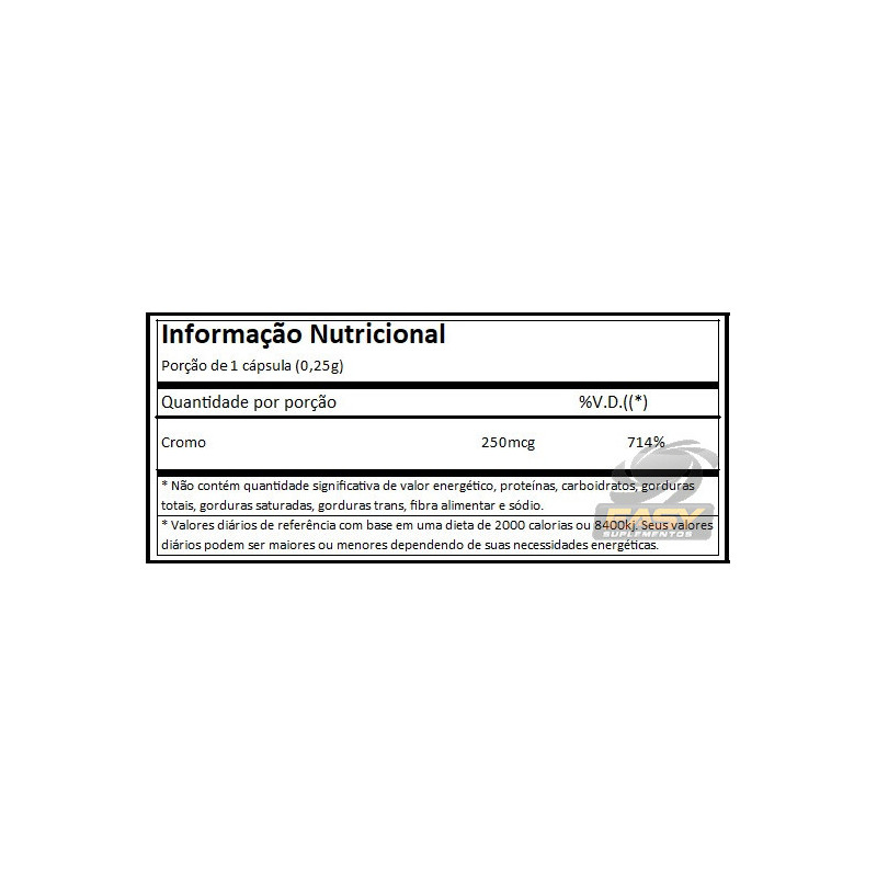 Amido, gelatina, água purificada, picolinato de cromo e dióxido de silício (antiumectante).