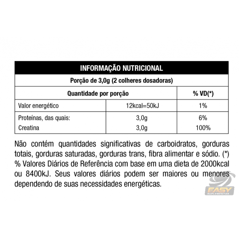 Creatina é um produto destinado a complementar os estoques endógeneos de creatina. Uma porção de creatina Creapure® contém 3g de creatina.