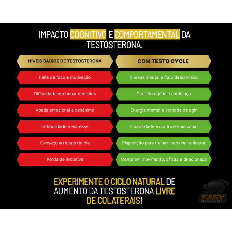 TESTO CYCLE é o ciclo natural que ativa sua testosterona sem colaterais. Com L-aspartico, Boro e vitaminas chave, ele libera sua força, desejo e foco. Para homens que querem potência de volta com respaldo científico e resultados reais.