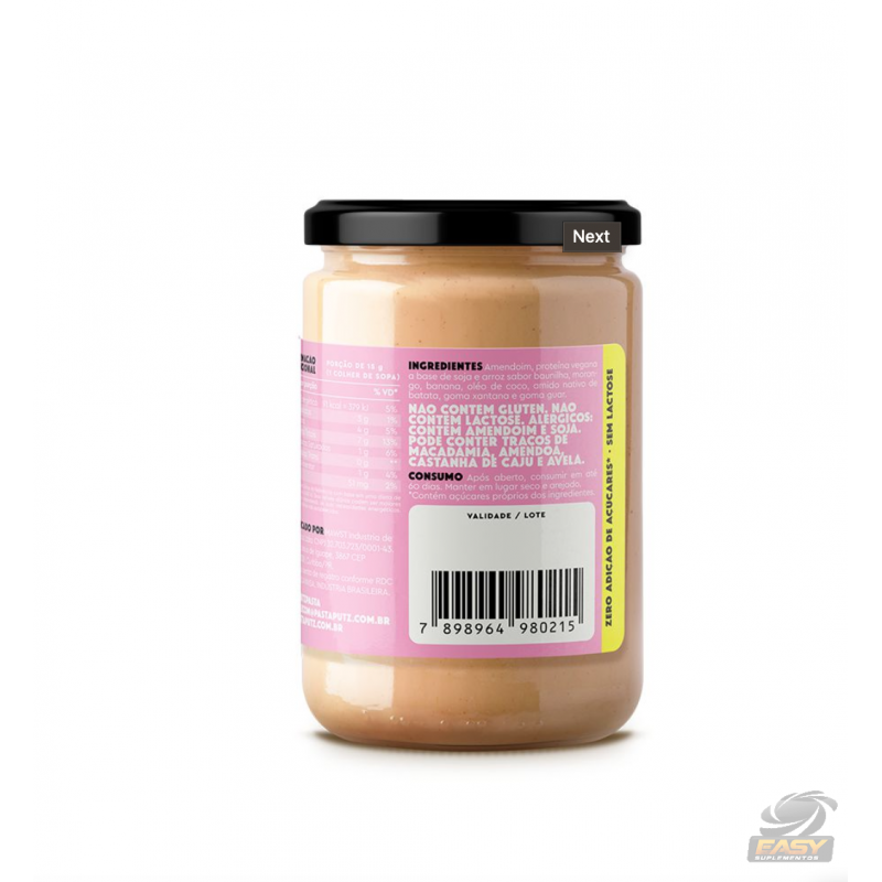 Amendoim, proteína vegana a base de soja e arroz sabor baunilha, morango, banana, óleo de coco, amido nativo de batata, goma guar.