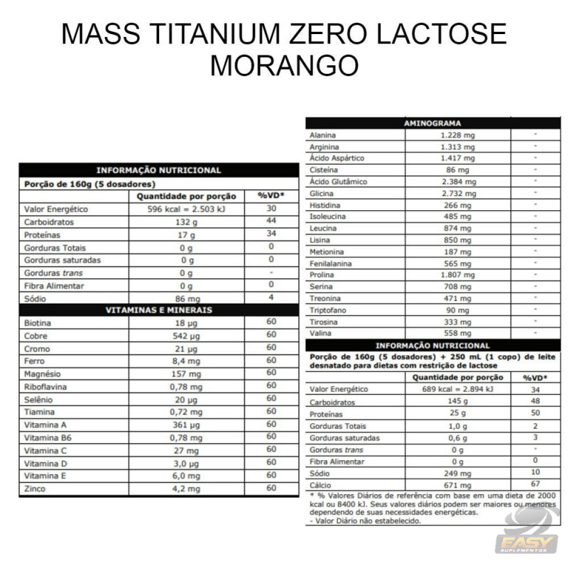 Hipercalórico completo e sem lactose! MASS TITANIUM 17500 ZERO LACTOSE combina três fontes proteicas de alta biodisponibilidade e digestibilidade e duas fontes de carboidratos.