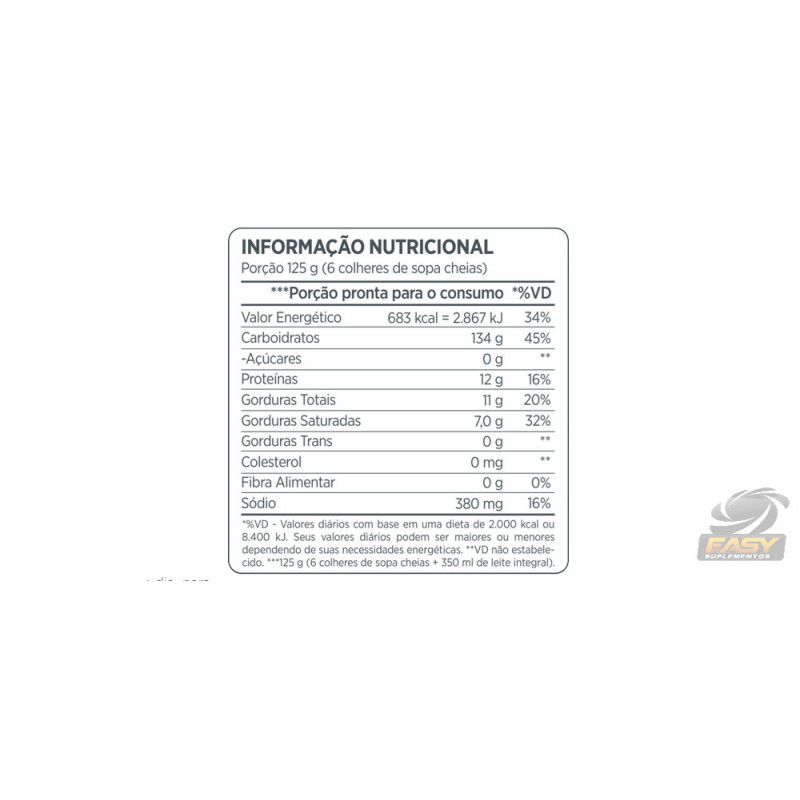 Maltodextrina, Proteína Concentrada do Soro do Leite, Cacau em Pó, Amido Amilopectina (Waxy Maize), Aromatizante e Edulcorante Sucralose. “NÃO CONTÉM GLÚTEN.” “ALÉRGICOS: CONTÉM DERIVADOS DE LEITE E SOJA (LECITINA*).” “CONTÉM LACTOSE.” *Ingrediente usado no processo de instantaneização da proteína do soro do leite.