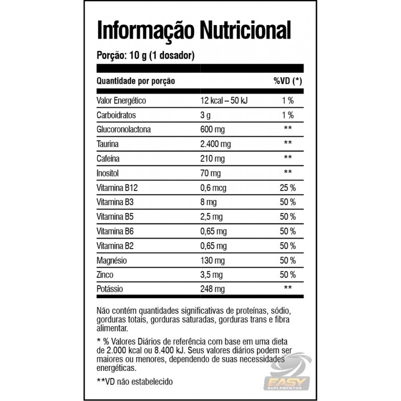 Taurina, Glucoronolactona, Cafeína, Inositol, Polpa desidratada de laranja, Cloreto de potássio, Óxido de magnésio, Óxido de zinco, Vitamina B12, Vitamina B3, Vitamina B5, Vitamina B6, Vitamina B2, veículo Maltodextrina, acidulante Ácido cítrico, aromatizante natural Extrato seco de citrus aurantium, aromatizante artificial, edulcorante Sucralose, antiumectante Dióxido de silício e corante artificial Amarelo crepúsculo.